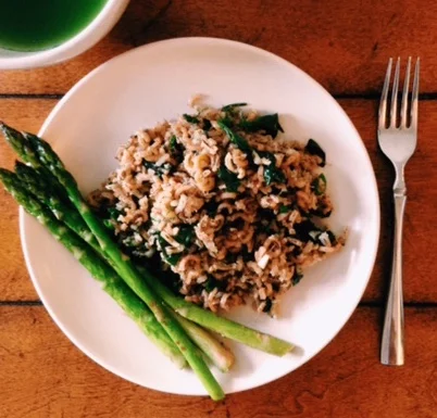 - When rice is almost done, in a small bowl, whisk together olive oil, lemon juice, garlic, sea salt, and pepper. Pour dressing over greens in a large (heat resistant) serving bowl. Mix well.